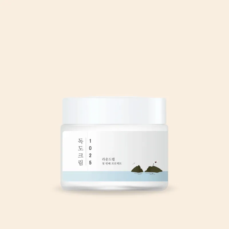Intensywnie nawilżający krem Round Lab 1025 Dokdo Cream z wodą Dokdo (90+ minerałów), ceramidami i kwasem hialuronowym. Wzmacnia barierę, nawilża i zapewnia komfort, idealny dla cery suchej.